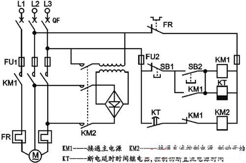製動過程:按下停止按鈕SB1→KM1斷電,KM1主觸點斷開,電機脫離電源,KM1輔助常閉觸點恢複閉合,KM2通電,接入直流電源,製動開始,同時KM1輔助常開觸點又恢複斷開,則KT線圈呈斷電狀態,延時開始,待所設延時時間到達後,KT的延時斷開常開觸點恢複斷開,KM2失電,切斷直流電源,製動結束。