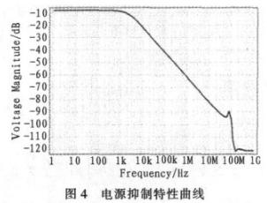 圖4是在1 Hz到10 GHz的範圍進行掃描所得到的不同的電源抑製情況。低頻時抑製情況不太好,在-10 dB左右,還有待於提高;高頻抑製情況很好,基本穩定在-120 dB左右。與傳統電路相比,本文提出的這種電路可以用於在各種係統尤其是高頻係統中,這一點是傳統電路所無法比擬的。
