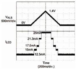 通過將背光調整到合適的水平,就可以顯著減少從電池吸收的功率。圖3顯示了一種使用情況,突出了在5個亮度區使用係統可能實現的電力節省:陽光、陰天室外、明亮的辦公室、昏暗的房間、夜間/電影院。亮度值分別設置為100%、85%、70%、60%和50%(25mA、21.3mA、17.5mA、15mA和12.5mA)。由於ALS的電壓上升(或通過傳感器增加環境光),在驅動器迫使LED電流變化之前,驅動IC在預定時間內對ALS電壓采樣。規定(或平均)時間內的ALS電壓采樣有助於防止在瞬息萬變的照明條件下出現LED閃爍。