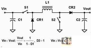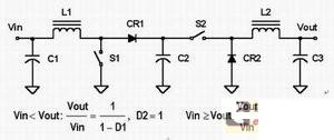 圖1a的電路盡管是四個電路中最複雜的,卻有幾個優點。它的輸入和輸出電流被電感平滑處理,減小了輸入和輸出端的紋波電流以及對電容C1和C3的電流應力。但是這一方案也有缺點,電容C2的電流不管是當Vin小於Vout時來自CR1還是當Vin大於Vout來自S2,它都會有中斷,而且它需要兩個電感。