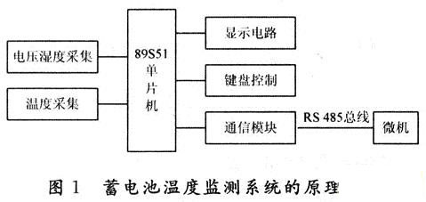 蓄電池溫度監測係統的原理框圖如圖1所示。主要由電壓、溫濕度采集、溫度采集、89S51單片機、鍵盤控製模塊、顯示電路模塊、通信模塊組成。該係統能完成6組或6組以上通信電池的溫度測量、1路機房環境測量(溫度、濕度測量)、2路直流電壓和2路交流電壓測量,傳輸數據距離大於200m。