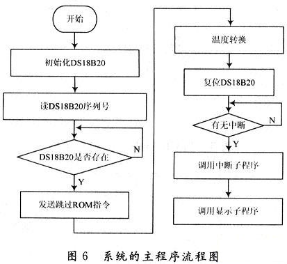 蓄電池溫度監測係統的軟件設計主要包括主程序、外部中斷子程序、顯示子程序等。圖6是該係統的主程序流程圖。用於完成對DS18B20的調用、中斷管理、測量溫度值的計算及溫度值的顯示等功能。主機89S51首先複位脈衝使信號線上所有的DS18B20芯片都被複位,接著發送跳過ROM操作命令,激活在線的所有DS18B20,然ran後hou係xi統tong轉zhuan人ren中zhong斷duan處chu理li流liu程cheng,完wan成cheng溫wen度du轉zhuan換huan,讀du取qu等deng工gong作zuo。外wai部bu中zhong斷duan子zi程cheng序xu完wan成cheng對dui溫wen度du測ce量liang數shu據ju的de讀du取qu,顯xian示shi子zi程cheng序xu完wan成cheng液ye晶jing顯xian示shi器qi的de初chu始shi化hua及ji顯xian示shi溫wen度du值zhi。
