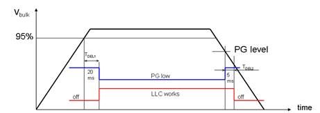 4. PFC異常檢測:PFC異常檢測的目的在於,如果PFC沒有正常工作,那麼即使出現高線路電壓,PFC和LLC均應停止工作。例如,在高線路電壓時PFC驅動器電阻損毀的情況。實現PFC異常檢測保護的方法是:如果VCTRL保持在最高電平或低於最低電平,如VCTRL引腳異常短路,且時間長於1秒(tPFCabnormal),則PFCok內部信號下降,PGout引腳立即釋放開路,通知係統電源將關閉;5 ms後LLC停止工作(tDEL2)。
