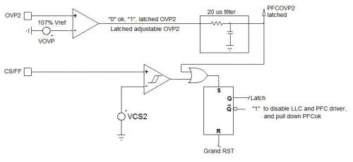 3. 冗餘OVP(閂鎖):專用OVP2引腳用來保護大電容;電路中內置的20 µs濾波器用來提供更佳的噪聲免疫性。當OVP2比較器被觸發時,PFC及LLC均關閉。PFCok信號假定為低電平時,PGout被釋放開路,使LLC停止工作。