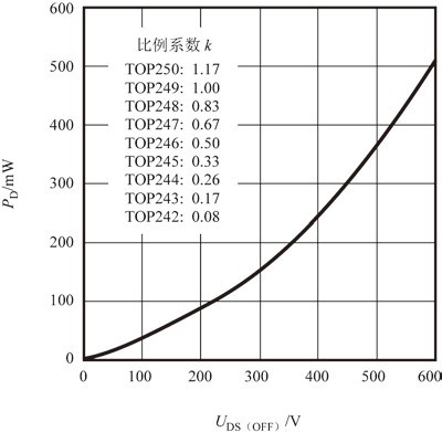 (3)若考慮到還有關斷損耗,從圖3中可查出PD=510mW=0.51W(UDS(OFF)=600V)。假定占空比為50%,在計算平均功耗時應將關斷損耗除以2。因此PD=9.72W+0.51W/2=9.975W,該結果就與10.0W非常接近。