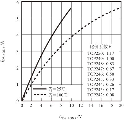 下麵對開關電源散熱器的設計要點作進一步分析。以TOPSwitch-GX(TOP242~TOP250)係列單片開關電源為例,當MOSFET導通時漏-源極導通電流(I DS(ON) )與漏-源極導通電壓(U DS(ON) )的歸一化曲線如圖2所示。