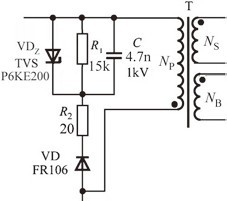 說明:這裏采用快恢複二極管而不使用超快恢複二極管,目的是配合阻尼電阻R 2,將部分漏感能量傳輸到二次側,以提高電源效率。