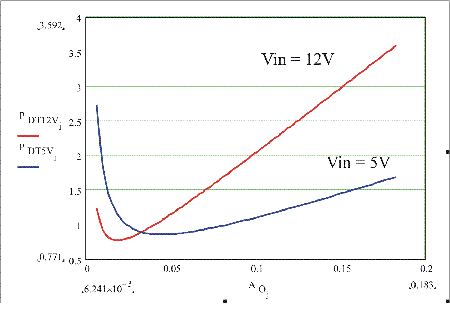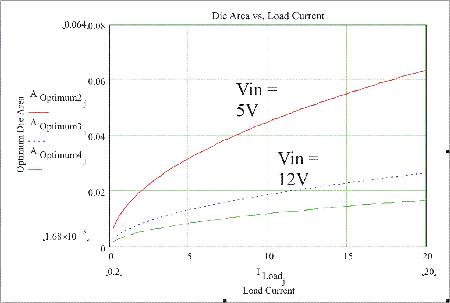 如圖5所示,功耗是裸片麵積的函數,周圍是針對輸入電壓為5到12V的頂部MOSFET的最合適值。這清楚地表麵,損耗高度依賴於裸片麵積以及如果裸片麵積增加或減少時這些損耗所增加或減小的劇烈程度。