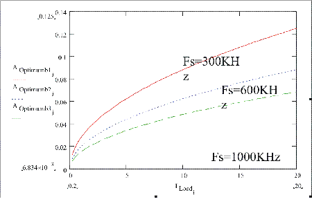 圖4:在同步整流器MOSFET不同開關頻率上的最優化裸片麵積是負載電流的函數。