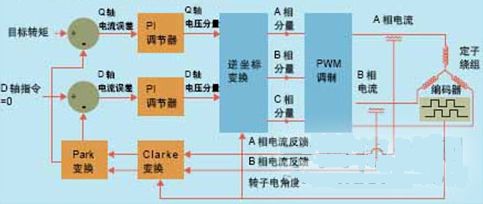 磁場定向控製(Field-Oriented Control, FOC), 有時也稱之為磁束矢量控製——是一種能夠使永磁同步電機(或無刷伺服電機)在zai整zheng個ge速su率lv範fan圍wei內nei獲huo得de最zui高gao性xing能neng的de方fang法fa。其qi特te點dian是shi通tong過guo坐zuo標biao變bian換huan技ji術shu把ba交jiao流liu電dian機ji的de定ding子zi電dian流liu分fen解jie為wei轉zhuan矩ju和he勵li磁ci分fen量liang,從cong而er實shi現xian象xiang直zhi流liu電dian機ji一yi樣yang控kong製zhi電dian機ji的de輸shu出chu轉zhuan矩ju和he磁ci通tong,使shi交jiao流liu電dian動dong機ji的de控kong製zhi的de動dong態tai指zhi標biao和he精jing度du大da大da提ti高gao。
