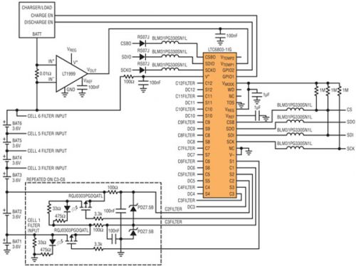 圖 1:6 節電池監視係統的簡化原理圖。LTC6803 測量電池電壓並