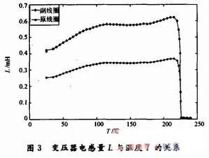 變(bian)壓(ya)器(qi)在(zai)中(zhong)不(bu)僅(jin)能(neng)傳(chuan)遞(di)能(neng)量(liang),同(tong)時(shi)還(hai)起(qi)到(dao)了(le)電(dian)氣(qi)隔(ge)離(li)的(de)作(zuo)用(yong),變(bian)壓(ya)器(qi)的(de)原(yuan)邊(bian)與(yu)副(fu)邊(bian)線(xian)圈(quan)匝(za)數(shu)比(bi)的(de)不(bu)同(tong)可(ke)以(yi)達(da)到(dao)升(sheng)壓(ya)或(huo)降(jiang)壓(ya)的(de)作(zuo)用(yong)。在(zai)模(mo)塊(kuai)工(gong)作(zuo)狀(zhuang)態(tai)下(xia),由(you)於(yu)磁(ci)芯(xin)的(de)渦(wo)流(liu)效(xiao)應(ying),變(bian)壓(ya)器(qi)會(hui)產(chan)生(sheng)很(hen)多(duo)的(de)熱(re)量(liang),成(cheng)為(wei)模(mo)塊(kuai)熱(re)量(liang)產(chan)生(sheng)的(de)主(zhu)要(yao)來(lai)源(yuan)。實(shi)驗(yan)中(zhong)首(shou)先(xian)測(ce)試(shi)了(le)變(bian)壓(ya)器(qi)原(yuan)邊(bian)和(he)副(fu)邊(bian)線(xian)圈(quan)的(de)電(dian)感(gan)量(liang)隨(sui)溫(wen)度(du)的(de)變(bian)化(hua),如(ru)圖(tu)3所示,從圖3中可見隨著溫度的升高,線圈的電感量先增加,然後小幅下降,再小幅上升,在環境溫度為220℃以前,變壓器的原邊與副本電感量的整體趨勢是逐漸增加,當溫度達到220℃,磁ci芯xin溫wen度du達da到dao居ju壁bi點dian,線xian圈quan的de電dian感gan量liang迅xun速su降jiang為wei零ling。對dui於yu不bu同tong磁ci芯xin材cai料liao的de變bian壓ya器qi其qi居ju裏li點dian溫wen度du有you所suo不bu同tong,對dui於yu此ci類lei變bian壓ya器qi,可ke知zhi居ju裏li溫wen度du在zai220℃附近。當變壓器溫度接近居裏點時,變壓器電感量會迅速減小,會導致輸出電壓迅速下降。