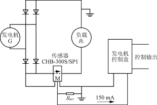 在某型地麵車輛上裝備了一套獨立的大功率發電係統,該發電係統設計選用了CHB-300S型(xing)閉(bi)環(huan)霍(huo)爾(er)電(dian)流(liu)傳(chuan)感(gan)器(qi)作(zuo)為(wei)係(xi)統(tong)電(dian)流(liu)檢(jian)測(ce)部(bu)件(jian),通(tong)過(guo)對(dui)傳(chuan)感(gan)器(qi)的(de)輸(shu)出(chu)信(xin)號(hao)進(jin)行(xing)處(chu)理(li),設(she)定(ding)限(xian)流(liu)工(gong)作(zuo)點(dian),確(que)保(bao)發(fa)電(dian)係(xi)統(tong)的(de)輸(shu)出(chu)功(gong)率(lv)不(bu)高(gao)於(yu)發(fa)電(dian)機(ji)的(de)額(e)定(ding)功(gong)率(lv)。閉(bi)環(huan)霍(huo)爾(er)電(dian)流(liu)傳(chuan)感(gan)器(qi)CHB-300S的應用,很好地實現了上述應用目的。如圖3所示,發電機G輸出正端彙流母線穿過CHB-300S/SP1的原邊電流穿孔,由傳感器CHB-300S/SP1檢測發電機的輸出電流,傳感器的輸出IM與yu發fa電dian機ji控kong製zhi盒he相xiang連lian,由you發fa電dian機ji控kong製zhi盒he設she定ding發fa電dian機ji的de輸shu出chu電dian流liu控kong製zhi點dian,依yi據ju此ci信xin號hao,對dui發fa電dian機ji的de輸shu出chu電dian流liu加jia以yi限xian製zhi,避bi免mian發fa電dian機ji因yin輸shu出chu功gong率lv過guo高gao而er發fa生sheng故gu障zhang或huo損sun壞huai,從cong而er保bao證zheng發fa電dian係xi統tong正zheng常chang工gong作zuo。