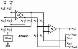 放大器A2將A1輸出的差分信號轉換成單端信號,並放大32.15倍。參考輸入端VREF1和VREF2都經過電阻RREF連接到A2的同相輸入端,使得輸出可以任意調整到所需要的輸出電壓範圍內。當兩個參考輸入端並聯使用時,參考電壓從輸入到輸出的增益為1V/V;當單獨使用任何一個參考輸入端時,其增益為0.5V/V。AD8205的總增益由衰減電路的衰減率1/16.7、A1的放大倍數26和A2的放大倍數32.15構成。AD8205具有300μA的吸收下拉電流能力,采用A類PNP管接上拉電阻輸出。