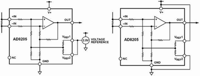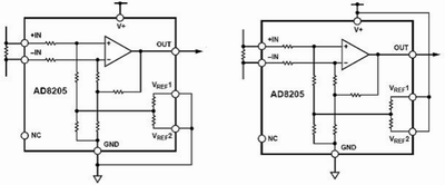 雙極性輸出時AD8205keyiceliangliuguocaiyangdianzushangdeshuangxiangdianliu,zheshi,shuchukeyipianzhidaoshuchufanweineiderenyiweizhi。dangbeijiancedezhengfanlianggefangxiangshangdedianliuweidengfushi,qishuchubixupianzhidaomanliangchengshuchudezhongjianweizhi。dangshuangxiangdianliufuzhibuduichengshi,shuchupianzhikeyiduiyingdipianlibanliangchengweizhi。tadelianggecankaoshuruVREF1和VREF2分別連接一個內部電阻RREF後hou接jie到dao同tong一yi個ge內nei部bu偏pian置zhi節jie點dian,這zhe兩liang個ge參can考kao輸shu入ru端duan的de操cao作zuo方fang式shi完wan全quan相xiang同tong。在zai兩liang個ge參can考kao電dian壓ya輸shu入ru端duan接jie入ru對dui應ying的de電dian壓ya,即ji可ke完wan成cheng對dui輸shu出chu的de偏pian置zhi。在zai雙shuang極ji性xing輸shu出chu方fang式shi下xia,一yi般ban有you以yi下xia兩liang種zhong連lian接jie方fang式shi。