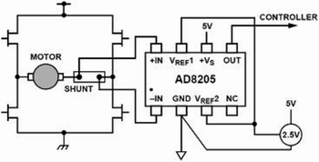 如圖5所示連接,AD8205在H橋馬達控製電路中作為控製回路的一部分,馬達和采樣電阻串連後放置在H橋的中間,通過檢測采樣電阻上的電壓,可以準確地測量馬達當前的電流及其方向。此時,AD8205的輸出被設定成外部參考雙向的方式,這樣它可以測量H橋(qiao)開(kai)關(guan)的(de)雙(shuang)向(xiang)電(dian)流(liu)並(bing)同(tong)時(shi)監(jian)測(ce)馬(ma)達(da)的(de)運(yun)轉(zhuan)方(fang)向(xiang)。由(you)於(yu)地(di)不(bu)是(shi)一(yi)個(ge)特(te)別(bie)穩(wen)定(ding)的(de)參(can)考(kao)電(dian)平(ping),以(yi)地(di)為(wei)參(can)考(kao)將(jiang)會(hui)導(dao)致(zhi)測(ce)量(liang)的(de)不(bu)準(zhun)確(que)性(xing)。因(yin)此(ci),這(zhe)種(zhong)測(ce)試(shi)方(fang)案(an)要(yao)比(bi)以(yi)地(di)作(zuo)為(wei)參(can)考(kao)電(dian)平(ping)的(de)測(ce)試(shi)方(fang)法(fa)好(hao)的(de)多(duo)。