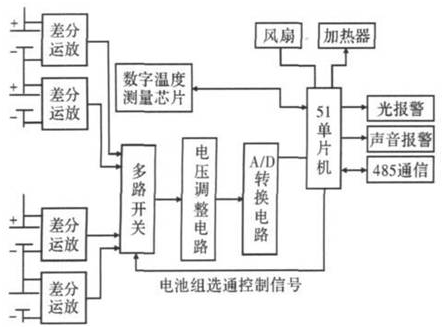 狀態采集模塊包括對單體電池的電壓和電池組的溫度等參數進行采集,然後待測量信號進行處理,通過A/D轉換器采樣後傳輸給單片機進行數據處理,將有效數據通過串口傳到本地PC 機,監測人員可以通過對狀態數據的進行分析從而掌握電池組的工作情況,對不安全的狀態進行及時的處理,確保其工作的可靠性。