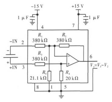 INA117 內置了380 kΩ、20 kΩ 和21. 1 kΩ3 個電阻,因此外部電路省去精密電阻,減少了精密電阻帶來的誤差和係統複雜程度。圖2 是INA117 輸出1 節電池電壓的接法,6 腳和1 腳之間的電壓就是1 節電池兩端的電壓差。