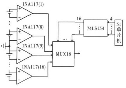 每節鋰離子電池最高電壓為5 V,由圖3 可得,第1 個INA117 的3 腳的輸入電勢最高為40 V.同理,第16 個INA117 的2 腳輸入電勢最低為- 40 V.第1 至8 個INA117 的輸出電壓為正,第9 至16 個INA117 的輸出電壓為負,所以多選一模擬開關和A/D 轉換器都要求可以輸入正、負電壓。多選一模擬開關選用MUX16,為16 選1 可正負電壓輸入模擬開關,因此16節電池隻需1 個MUX16.但由於單片機IO 口有限,文中用一片74LS154 擴展了IO 口,僅用單片機的4 個IO 口即可控製MUX16 分別選通單節鋰離子電池進行電壓采樣。