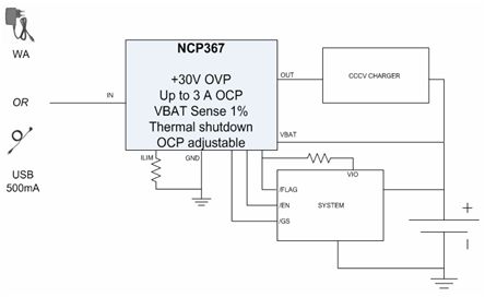 以NCP367為例,這是一款提供+30 V過壓保護及高達3 A過流保護、帶電池電壓檢測功能的保護IC(見圖5)。這器件保護便攜設備電池免受輸入過壓(在出現故障工作條件下會斷開係統與Vbus或AC-DC適配器的連接)、充電過流及充電過壓影響。NCP367提供最大值100 mΩ的低導通阻抗,幫助降低方案成本及電路板占用空間。支持高達3 A電流的能力幫助實現快速充電。典型值50 μA的極低電流消耗兼容於USB 500 μA閑置模式。這器件能用於1.5 A或500 mA兩種充電電流等級,非常適合手機等應用。