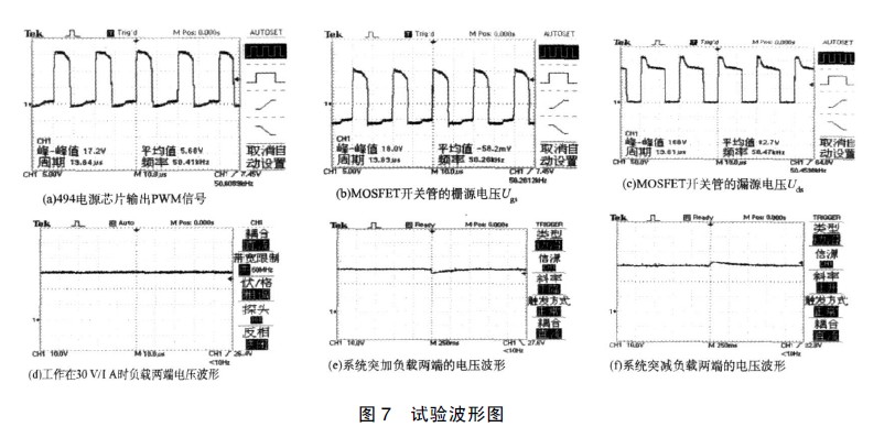通過調壓器在供電電源端輸入110 V 的交流電壓, 使得係統穩定的工作在30 V、1 A 的負載下, 觀察TL494 電源芯片輸出的驅動信號波形、MOSFET 開關管Ugs、Uds 、負載正常工作時的波形、以及突然加載、突然掉載情況, 其試驗波形如圖7。