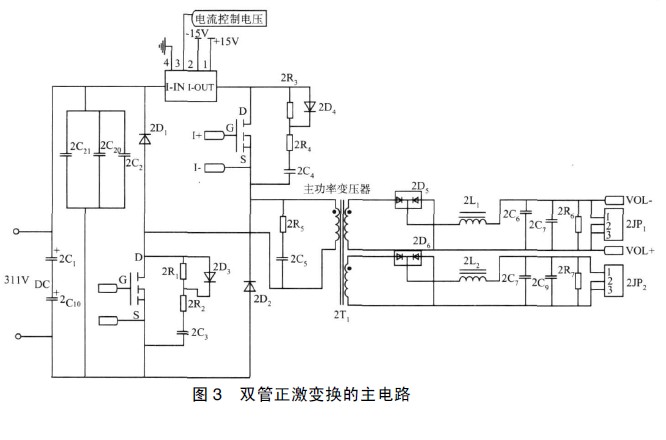 從圖3 可以看出, 電路結構簡單, 容易實現, 並在MOSFET 橋臂增加了霍爾傳感器, 以保證輸出反饋電流環的要求。為了增加電路的通用性, 設計的電路板增加了雙路輸出的功能, 隻要改變變壓器的設計, 即可以完成多路輸出。當兩個主功率開關管截止時, 原邊繞組的電壓極性相反, 使另外一橋臂的兩個二極管導通, 電壓被箝位在輸入電壓值。因此開關管承受的電壓與輸入電壓相同。在輸入電壓最大值低於350 V時, 開關管隻需要選擇450 V 的耐壓值即可。這裏我們選用N 溝道MOSFET , IRF830( 4. 5 A/ 500 V) 。