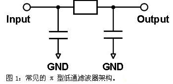 為有效解決電子產品電磁幹擾的問題,並能兼顧靜電放電(ESD)防護的功用,可以采用具有靜電放電防護功能的電磁幹擾濾波器(EMI+ESD filter)。圖1所示即為常見的π型低通濾波器。在Input及Output端點之間的組件,可以是電阻或是電感組件。是采用電阻還是電感,應視產品的實際應用所需而定。