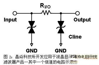 晶焱科技(Amazing Microelectronic Corp.)在靜電放電防護技術上已累積了豐富的經驗與技術。公司開發的應用於液晶顯示器的電磁幹擾濾波器產品基本架構如圖2所示。由圖2電路示意圖可知:π型低通濾波器的Input與Output之間是采用電阻(RI/O)組件橋接,Input端點及Output端點對GND的電容則是采用雙向導通(bi-directional)的瞬時電壓抑製器(TVS)。因此,該係列產品除了可以提供良好的低通濾波效果之外,還擁有很好的靜電放電防護效果。