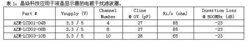 表1所列為晶焱科技已推出的應用於液晶顯示器的電磁幹擾濾波器係列產品。適用於5V以下的額定電壓電路係統,線電容值約為27微微法拉(pF)。操作頻率在800百萬赫茲(MHz)時,其功率損耗可達-23dB,keyixianzhudijiangdidianciganraoxinhao,yiweichishoubaohudianludecaozuogongnengzhengchang。jingyankejitongshituichusanzhongbutongtongdaoshudedianciganraolvboqichanpin,yifangbianqikehuyizhaobutongxuqiuxuanyongheshidechanpin。