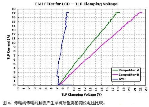在(zai)靜(jing)電(dian)放(fang)電(dian)事(shi)件(jian)的(de)高(gao)導(dao)通(tong)電(dian)流(liu)下(xia),瞬(shun)時(shi)電(dian)壓(ya)抑(yi)製(zhi)器(qi)的(de)箝(qian)位(wei)電(dian)壓(ya)越(yue)低(di)則(ze)越(yue)能(neng)適(shi)時(shi)地(di)被(bei)導(dao)通(tong),以(yi)使(shi)受(shou)保(bao)護(hu)電(dian)路(lu)免(mian)於(yu)遭(zao)受(shou)靜(jing)電(dian)放(fang)電(dian)的(de)侵(qin)害(hai)而(er)永(yong)久(jiu)受(shou)損(sun)失(shi)效(xiao)。圖(tu)3所示為利用傳輸線脈衝產生係統(TLP)所量得的箝位電壓比較圖。由圖中可以清楚看到,晶焱科技應用於液晶顯示器的電磁幹擾濾波器,在17安培的高靜電放電電流下具有最低的箝位電壓,可以非常有效地提供受保護電路一個快速有效的靜電放電旁通路徑。