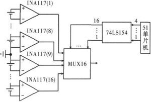每節鋰離子電池最高電壓為5V,由圖3可得,第1個INA117的3腳的輸入電勢最高為40V。同理,第16個INA117的2腳輸入電勢最低為-40V。第1至8個INA117的輸出電壓為正,第9至16個INA117的輸出電壓為負,所以多選一模擬開關和A/D轉換器都要求可以輸入正、負電壓。多選一模擬開關選用MUX16,為16選1可正負電壓輸入模擬開關,因此16節電池隻需1個MUX16.但由於單片機IO口有限,文中用一片74LS154擴展了IO口,僅用單片機的4個IO口即可控製MUX16分別選通單節鋰離子電池進行電壓采樣。