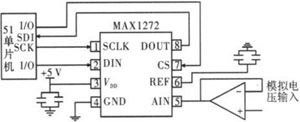 圖4中MAX1272采用了內部參考電壓,6腳VREF 和地之間接2.2μF鉭電容和0.1μF陶瓷電容。