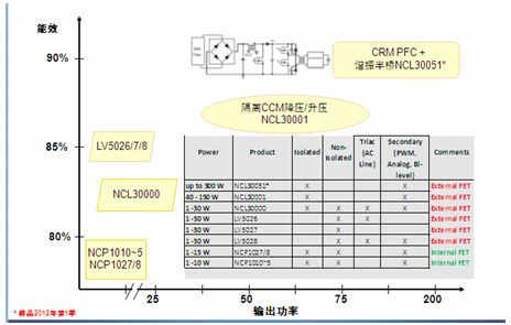 在安森美半導體用於LED照明的AC-DC電源方案中,1至10 W的照明應用中推薦使用NCP1010~5,1至15 W可使用NCP1027/8,這些方案集成了MOS管,適用於隔離和非隔離應用,支持次級PWM調光、模擬調光或雙亮度等級調光,能效高達75-80%;1至30 W的應用可以使用LV5026、5027、5028,支持隔離方案,典型能效85%左右;1至40 W推薦使用NCL30000,可進行初級可控矽調光,適用於隔離和非隔離方案,隔離方案能效80-85%。40至150 W推薦使用NCL30001,它是一個連續導電模式(CCM)控製芯片,隔離方案的典型能效85-90%;更大功率推薦使用NCL30051。圖2是這些方案輸出功率與能效的對比。以下將具體介紹這些方案的功能和特點。