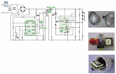 1) 支持熱反走的AC可調光A19 LED燈:輸入電壓為90至135 Vac,5 W額定輸出功率(10 V @ 500 mA),可驅動3顆串聯LED;隔離式熱反走,溫度上升時線性減小輸出電流;功率因數>0.96,能效>77%;針對“能源之星”1.1版整體式LED燈要求;兼容TRIAC及晶體管調光器。