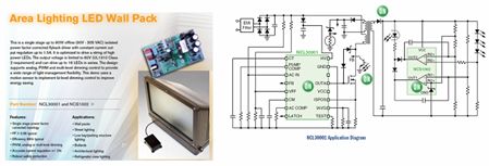 NCL30001功率因數校正(PFC)可調光LED驅動器適用於中大功率應用(功率可達90 W),如建築物裝飾光。支持的調光有三種方式:1-10 V模擬電壓輸入(1 V = 最小值,10 V為100%導通時的值);兩級雙電平模擬調光;以及PWM調光(調光頻率範圍350 Hz至3 kHz,調光範圍> 10:1)。保護特性包括:輸出開路及短路保護、過溫保護、過流保護、過壓保護和過溫反走。