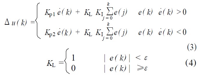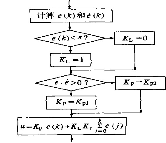 ③當│e(k)│≤ε時,即偏差值e(k)進入穩態區域時,加入積分環節,可保證係統的控製精度。