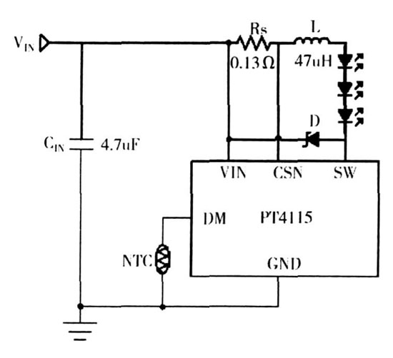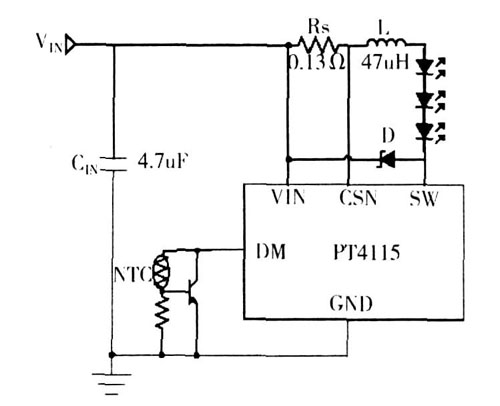 4) PT4115 內部自帶過溫保護功能,外部過溫保護可設,對LED 實現雙重保護;