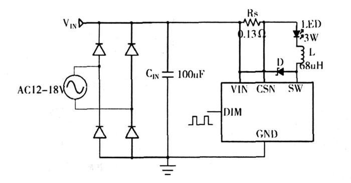 對於PT4115 (見圖4) 即可以應用於12~18 V 的交流,也可應用在8 V~30 V 的直流。因此,應用範圍更加廣泛。並且,驅動電路簡單,所需元器件均價格低廉。適合批量、市場化。