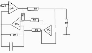 電壓-電流轉換模塊還有另外一種方案,即采用三個運放構成輸出電流可變的電流源,如圖3所示。輸出電流I=Vi/R1,為使R1兩端的電壓保持恒定,由差分放大器IC1b通過射隨器IC1c監測R1兩端的電位,此電位經IC1b的7腳加到比較器 ICa的反相輸入端與Vref比較,根據比較結果使比較器的輸出端變化,直到平衡為止,即Vr1=Vi。電路中的電容用於補償ICa的頻率,減少控製環路的延時。隻要R1=R2=R3=R4=R5,此電路的性能較好,但帶負載能力不強,環路延時補償對電路的穩定有較大影響。