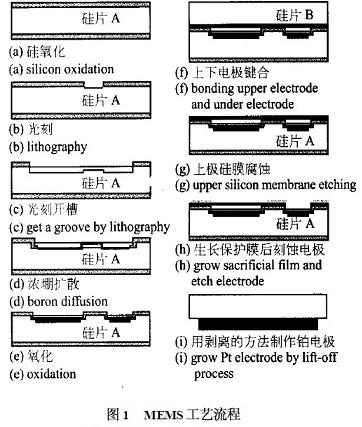 高溫壓力傳感器由矽膜片、襯底、下(xia)電(dian)極(ji)和(he)絕(jue)緣(yuan)層(ceng)構(gou)成(cheng)。其(qi)中(zhong)下(xia)電(dian)極(ji)位(wei)於(yu)厚(hou)支(zhi)撐(cheng)的(de)襯(chen)底(di)上(shang)。電(dian)極(ji)上(shang)蒸(zheng)鍍(du)一(yi)層(ceng)絕(jue)緣(yuan)層(ceng)。矽(gui)膜(mo)片(pian)則(ze)是(shi)利(li)用(yong)各(ge)向(xiang)異(yi)性(xing)腐(fu)蝕(shi)技(ji)術(shu),在(zai)一(yi)片(pian)矽(gui)片(pian)上(shang)從(cong)正(zheng)反(fan)麵(mian)腐(fu)蝕(shi)形(xing)成(cheng)的(de)。上(shang)下(xia)電(dian)極(ji)的(de)間(jian)隙(xi)由(you)矽(gui)片(pian)的(de)腐(fu)蝕(shi)深(shen)度(du)決(jue)定(ding)。矽(gui)膜(mo)片(pian)和(he)襯(chen)底(di)利(li)用(yong)鍵(jian)合(he)技(ji)術(shu)鍵(jian)合(he)在(zai)一(yi)起(qi),形(xing)成(cheng)具(ju)有(you)一(yi)定(ding)穩(wen)定(ding)性(xing)的(de)矽(gui)膜(mo)片(pian)電(dian)容(rong)壓(ya)力(li)傳(chuan)感(gan)器(qi)[2]。由(you)於(yu)鉑(bo)電(dian)阻(zu)耐(nai)高(gao)溫(wen),且(qie)對(dui)溫(wen)度(du)敏(min)感(gan),選(xuan)用(yong)鉑(bo)電(dian)阻(zu),既(ji)可(ke)以(yi)當(dang)普(pu)通(tong)電(dian)阻(zu)使(shi)用(yong),又(you)可(ke)以(yi)作(zuo)為(wei)溫(wen)度(du)傳(chuan)感(gan)器(qi)用(yong)以(yi)探(tan)測(ce)被(bei)測(ce)環(huan)境(jing)的(de)溫(wen)度(du)。金(jin)屬(shu)鉑(bo)電(dian)阻(zu)和(he)矽(gui)膜(mo)片(pian)的(de)參(can)數(shu)為(wei):0℃時鉑電阻值為1000Ω;電阻率為1.0526316×10-5Ω·cm;密度為21440kg/m3;比熱為132.51J/(kg·K)、熔斷溫度為1769℃,故鉑電阻可加工為寬度為0.02mm;厚度為0.2μm;總長度為3800μm,製作成鋸齒狀,可在幅值為10V的階躍信號下正常工作。電容式壓力傳感器的上下電極的間隙為3μm、圓形平板電容上下電極的半徑為73μm、其電容值為50pF。具體工藝流程圖如圖1所示。