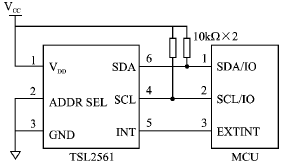 TSL2561可以通過I2C總線訪問,所以硬件接口電路非常簡單。如果所選用的微控製器帶有I2C總線控製器,則將該總線的時鍾線和數據線直接與TSL2561的I2C總線的SCL和SDA分別相連;如果微控製器內部沒有上拉電阻,則還需要再用2個上拉電阻接到總線上。如果微控製器不帶I2C總線控製器,則將TSL2561的I2C總線的SCL和SDA與普通I/O口連接即可;但編程時需要模擬I2C總線的時序來訪問TSL2561,INT引腳接微控製器的外部中斷。硬件連接如圖3所示。
