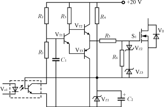 設計的驅動電路如圖5所示,它由驅動脈衝放大和5V基準兩部分組成。脈衝放大包括光耦Vo1,R1和R2,中間級的VT1,推挽輸出電路VT2和VT3,對高頻幹擾信號進行濾波的C1;5V基準部分包括R4,VZ1和C2,它既為MOS管提供-5V的偏置電壓,又為輸入光耦提供副邊電源。其工作原理是: