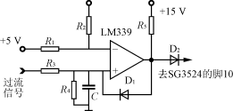 過流保護是利用SG3524的腳10加高電平封鎖脈衝輸出的功能。當腳10為高電平時,SG3524的腳11及腳14上輸出的脈寬調製脈衝就會立即消失而成為零。過流信號取自電流互感器(對SG3524-1芯片串接在工頻變壓器的副邊,對SG3524-2芯片串接在濾波電路前),經整流後得到電流信號加至如圖6所示過流保護電路上。過流信號加至電壓比較器LM339的同相端。當過流信號使同相端電平比反相端參考電平高時,比較器將輸出高電平,則二極管D2jiangcongyuanlaidefanxiangpianzhizhuangtaizhuanbianweizhengxiangdaotong,bingbatongxiangduandianweitishengweigaodianping,zheyibianhuajiangshidedianyabijiaoqiyizhiwendingshuchugaodianpingfengsuomaichong,zeBoost電路停止工作,在正常狀態下,比較器輸出零電平,不影響Boost電路工作。