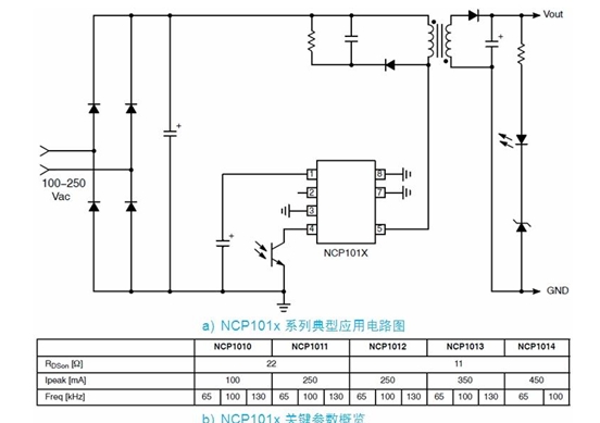 以 NCP101x 為例,這係列器件集成了固定頻率電流模式控製器及典型導通阻抗為 11 或 22 Ω 的 700 V MOSFET,提供構建強固及低成本開關電源所需的全部特性,包括軟啟動、頻率抖動、短路保護、跳周期、最大峰值電流設定點及動態自供電(不需要輔助繞 組)等。在正常負載工作期間,NCP101x 以 65、100 及 130 kHz 中的某一頻率開關;而當電流設定點降到低於某個給定值(如輸出功率需求消失)時,NCP101x 自動進入所謂的跳周期模式(在此模式下跳除不需要的開關周期),從而提供極佳的輕載能效。由於進入跳周期模式通常發生在最大峰值電流的 1/4 時,故沒有可聽噪聲產生。因此,待機能耗降至最低,且沒有可聽噪聲產生。NCP101x 典型應用電路及不同型號的關鍵參數參見圖 2。