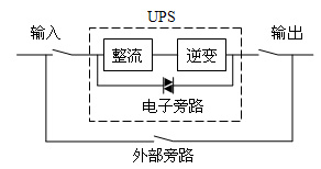 本係統設計利用美國山特公司3C3 UPS的特性,該UPS有一個內部電子旁路檢修開關,UPS在關機狀態下,電源是通過UPS內部電子旁路直接輸出供電。外部再加一個旁路開關(圖1),外部旁路開關與內部電子旁路開關形成並聯。UPS加入供電係統時, UPS必須在關機狀態下,接通UPS輸入輸出端開關,UPS與外部旁路開關形成並聯接通,然後斷開外部旁路開關,再將UPS開機。UPS退出供電係統時,必須先將UPS關機,接通外部旁路開關(若UPS未在關機狀態下,相當於UPS在開機時輸出端加入反向電壓,UPS可能燒毀),斷開UPS輸入輸出端開關, UPS退出供電係統。這樣就很容易做到將UPS加入和退出供電係統中。