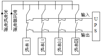 廠區供電係統是由一台630kw變壓器和一台800kw備bei用yong發fa電dian機ji組zu組zu成cheng,變bian壓ya器qi和he發fa電dian機ji的de切qie換huan方fang式shi是shi通tong過guo一yi個ge雙shuang頭tou刀dao閘zha進jin行xing切qie換huan的de,要yao在zai正zheng常chang生sheng產chan情qing況kuang下xia對dui四si台tai假jia撚nian機ji同tong時shi進jin行xing電dian源yuan切qie換huan,需xu要yao一yi台tai480kw 或四台120kw 的UPS不間斷電源;發電機在空載時,最大能同時加載負載是發電機功率的50%,需要配備發電機的功率為1200kw,現有發電機滿足不了要求,隻能采取逐台切換方法。