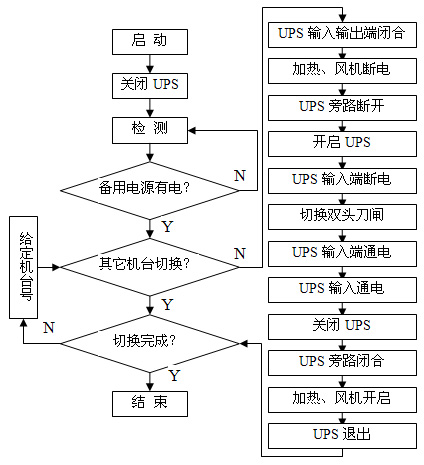電源切換控製過程中(圖3),首先PLCpanduanbeiyongdianyuanshifougongdaoxianchang,beiyongdianyuanmeiyougongdaoxianchangbunengqiehuan。youyucaiyongxunhuanqiehuanfangfa,ruoliangtaijianianjitongshiqiehuan,gongdiandianyuanbushiyigedianyuanshi,liangtaijianianjigongdiandianyuanyuUPS連接的接觸器同時閉合,兩個不同電源短路相連,發電機和變壓器出現並網(圖2)。PLC檢測是否有其它假撚機在切換,沒有其它機台切換時,UPS輸入輸出端的接觸器閉合,UPS與該機台的輸入總電源接觸器形成並聯(以下稱外部旁路開關)。