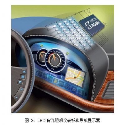 LED 背光照明的另一個重要好處是,高性能 LED 驅動器 IC 提(ti)供(gong)的(de)寬(kuan)調(tiao)光(guang)比(bi)能(neng)力(li)。由(you)於(yu)汽(qi)車(che)內(nei)部(bu)經(jing)受(shou)著(zhe)範(fan)圍(wei)非(fei)常(chang)寬(kuan)的(de)環(huan)境(jing)照(zhao)明(ming)條(tiao)件(jian)變(bian)化(hua),包(bao)括(kuo)從(cong)太(tai)陽(yang)光(guang)直(zhi)射(she)到(dao)完(wan)全(quan)黑(hei)暗(an)之(zhi)間(jian)的(de)每(mei)一(yi)種(zhong)變(bian)化(hua),而(er)人(ren)眼(yan)對(dui)光(guang)輸(shu)出(chu)中(zhong)的(de)微(wei)小(xiao)擾(rao)動(dong)又(you)非(fei)常(chang)敏(min)感(gan),顯(xian)示(shi)屏(ping)需(xu)要(yao)相(xiang)應(ying)地(di)調(tiao)暗(an)或(huo)調(tiao)亮(liang),因(yin)此(ci)首(shou)要(yao)的(de)是(shi),LED 背光照明係統能提供從 1,000:1 到高達 30,000:1 的非常寬調光比。采用合適的 LED 驅動器 IC,這類寬調光比相對容易實現,而用 CCFL 背光照明則是不可能的。圖 3 顯示了一個 LED 背光照明儀表板和共享 LED 背光照明的信息娛樂係統顯示屏。