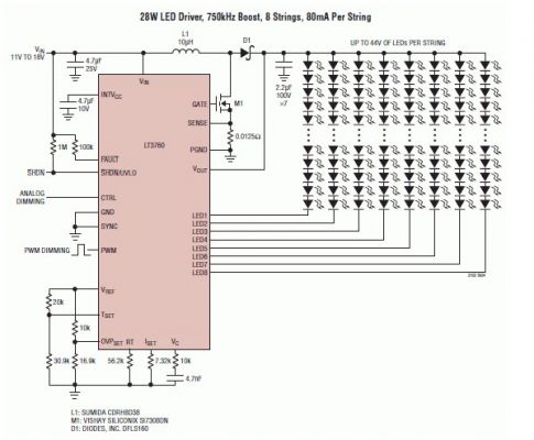 由於大多數汽車 LCD 背光照明應用都需要 20W 至 35W 的 LED 功率,所以 LT3760 設計為滿足這些需求。該器件可以將汽車總線電壓 (6V 至 18V / 標稱 12V) 升高至 44V,以驅動 8 個並聯 LED 串(每串含有 10 個 80mA 的串聯 LED)。圖 4 顯示了 LT3760 驅動 8 個並聯 LED 串的原理圖,每串由 10 個 80mA 的 LED 組成,總功率為 28W。