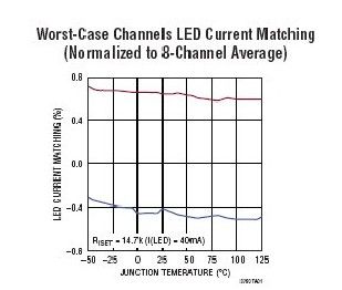 LT3760 采用自適應反饋環路設計,該設計調節輸出電壓以使其略高於 LED 串的最高電壓。這最大限度地減小了通過鎮流電路損失的功率,並幫助優化了效率。圖 2 中的電路提供高於 90% 的效率。這很重要,因為消除了任何散熱需求,從而實現了占板麵積非常緊湊的扁平解決方案。就驅動 LED 陣列而言,同樣重要的是,提供準確的電流匹配,以確保在整個儀表板上保持背光照明亮度一致。LT3760 在 -40度 至 125度的溫度範圍內保證 LED 電流變化不到 ±2%,而且正如在圖 5 中能看到的那樣,它的典型值較接近 ±0.5%。